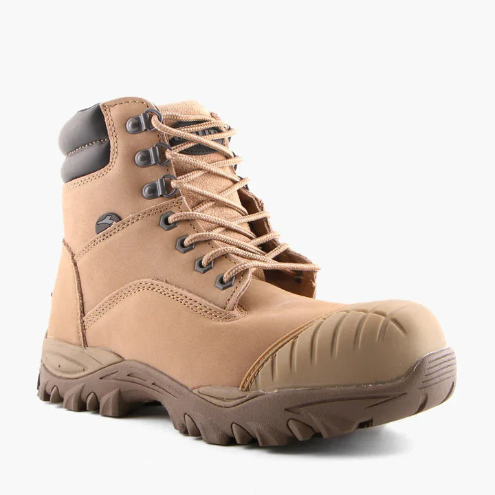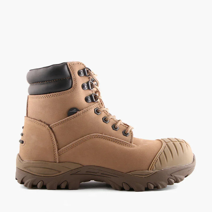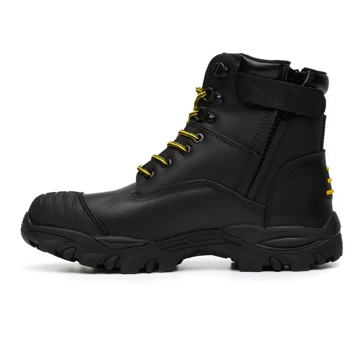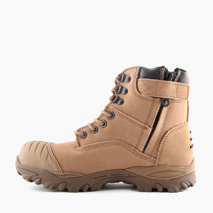 Value priced safety boot with padded collar & tongue, water resistant cow nubuck upper, medial YKK 8 zip for convenient entry/exit, tough but lightweight composite toe cap, phylon midsole for enhanced cushioning, external TPU scuff resistant toe cap for increased durability, padded PU insole, nitrile rubber outsole that is resistant to 300